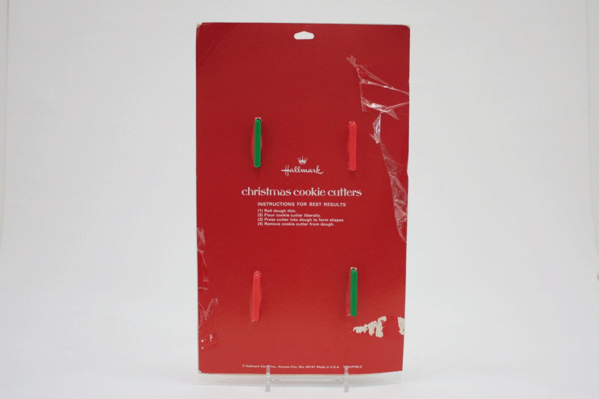 We had several Hallmark cookie cutters in our home when I was a child and one of my favorites, a Christmas tree, is included in this set of 4. The red and green cookie cutters are made of plastic and still attached to the original display card in unused, like new condition. This set includes a green snowman cookie cutter, a red Santa Claus cutter, a green angel cookie cutter and the aforementioned red Christmas tree cookie cutter.